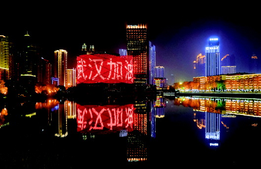 ▲1月31日,武漢市武昌區水果湖地區一處建筑外墻打出“武漢加油”字樣。 新華社記者程敏攝