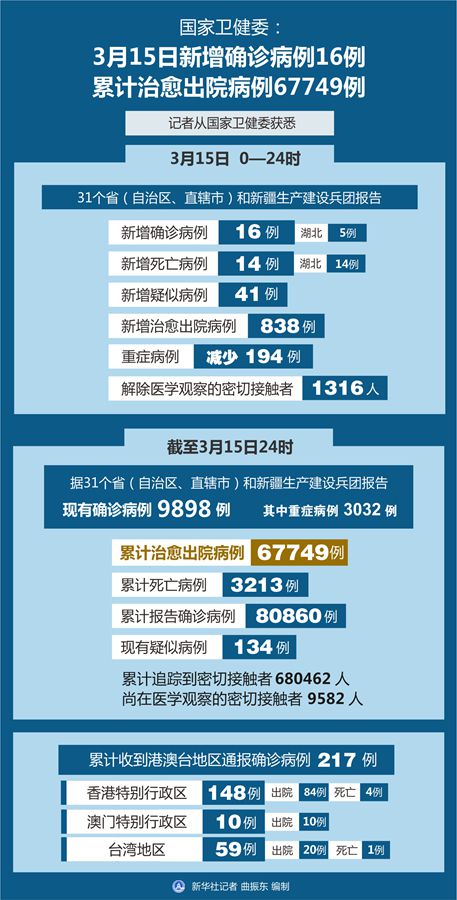 截至3月15日24時,據(jù)31個省(自治區(qū)、直轄市)和新疆生產(chǎn)建設兵團報告,現(xiàn)有確診病例9898例(其中重癥病例3032例),累計治愈出院病例67749例,累計死亡病例3213例,累計報告確診病例80860例,現(xiàn)有疑似病例134例。累計追蹤到密切接觸者680462人,尚在醫(yī)學觀察的密切接觸者9582人。
