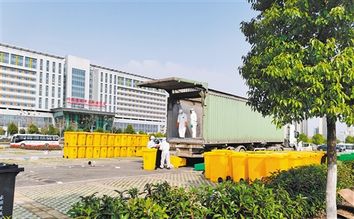 工作人員轉運華中科技大學附屬同濟醫院中法新城院區醫廢垃圾。 楚 環攝(中經視覺)