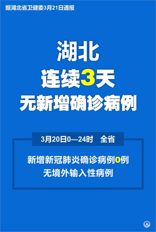 新華社武漢3月21日電(記者侯文坤)據湖北省衛健委21日通報,3月20日0—24時,全省新增新冠肺炎確診病例0例,無境外輸入性病例。