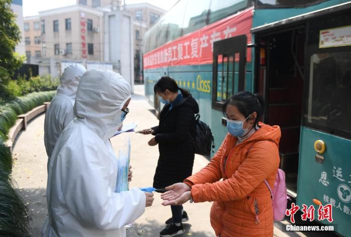 3月19日,湖北恩施復工人員到達杭州洲際食品有限公司后進行防疫消毒。當日,來自湖北省恩施州的首批146名赴杭州復工人員抵達浙江杭州。 中新社記者 王剛 攝