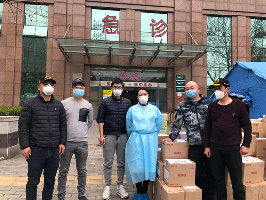 武漢市中心醫院醫生接收志愿者送去的物資。
