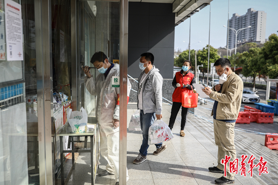 3月19日,湖北省武漢市一家藥店,幾名志愿者在幫忙買藥。中青報·中青網記者 趙迪/攝