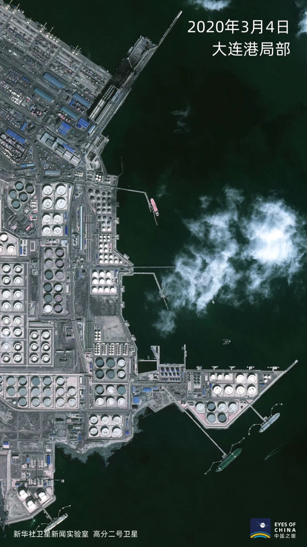 大連港新港油品物流區,可滿足世界上最大的ULCC級(44萬噸級“泰歐”輪)油輪滿載進港靠泊作業的45萬噸原油碼頭,以及10萬噸LNG碼頭和15萬噸成品油碼頭,全部停靠著船只。