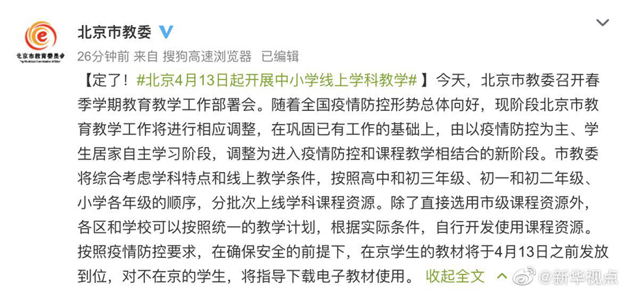 定了!北京4月13日起開展中小學(xué)線上學(xué)科教學(xué)-新華網(wǎng)