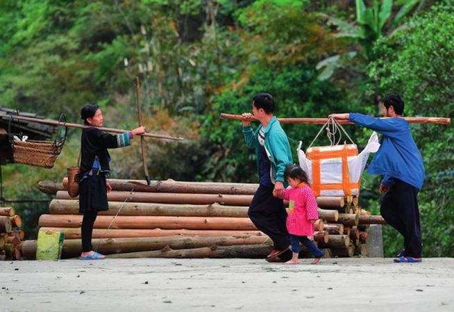 3月25日,桂黔烏英苗寨,村民抬著廣西融水苗族自治縣扶貧部門送來(lái)的螺苗,準(zhǔn)備投放 黃孝邦攝/本刊