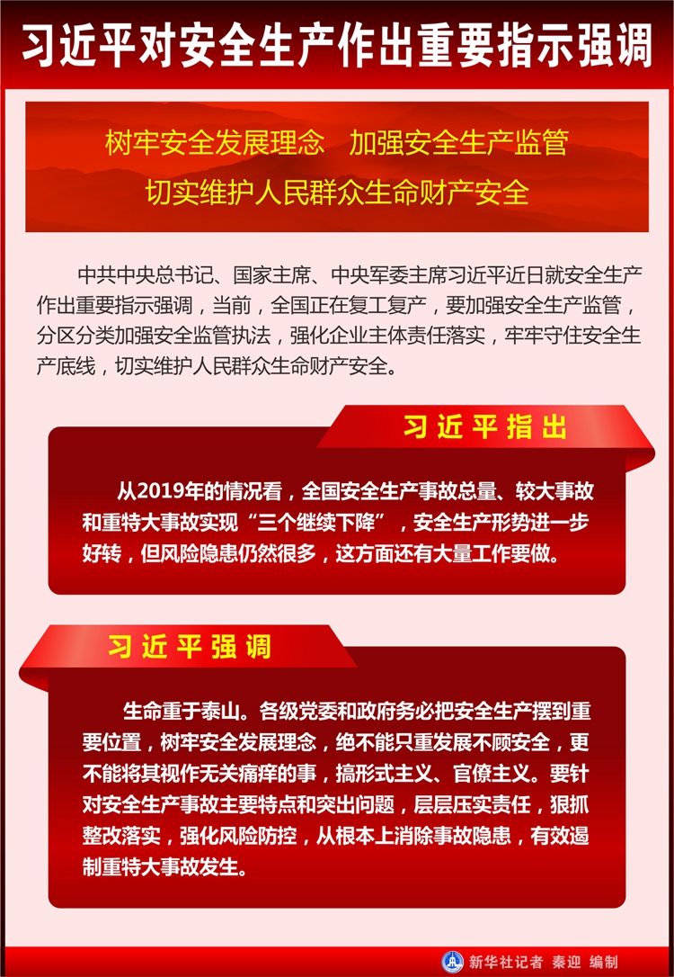 中共中央政治局常委、國務院總理李克強作出批示指出,當前,全國正處于統籌推進新冠肺炎疫情防控和復工復產的關鍵時期,安全生產意識和工作絲毫不能放松。各地區、各有關部門和各單位要堅持以習近平新時代中國特色社會主義思想為指導,認真貫徹落實黨中央、國務院決策部署,樹牢安全發展理念,層層壓實責任,深入排查各領域各環節安全生產隱患,全面開展安全生產專項整治三年行動,堅持系統治理、精準施策,扎實推進危險化學品、礦山、交通運輸、工業園、城市建設、危險廢物等重點領域安全整治,確保見到實效;加快建立健全安全生產責任和管理制度體系、隱患排查治理和風險防控體系,加強監管執法和安全服務,堅決遏制重特大事故發生,切實維護人民群眾生命財產安全。
