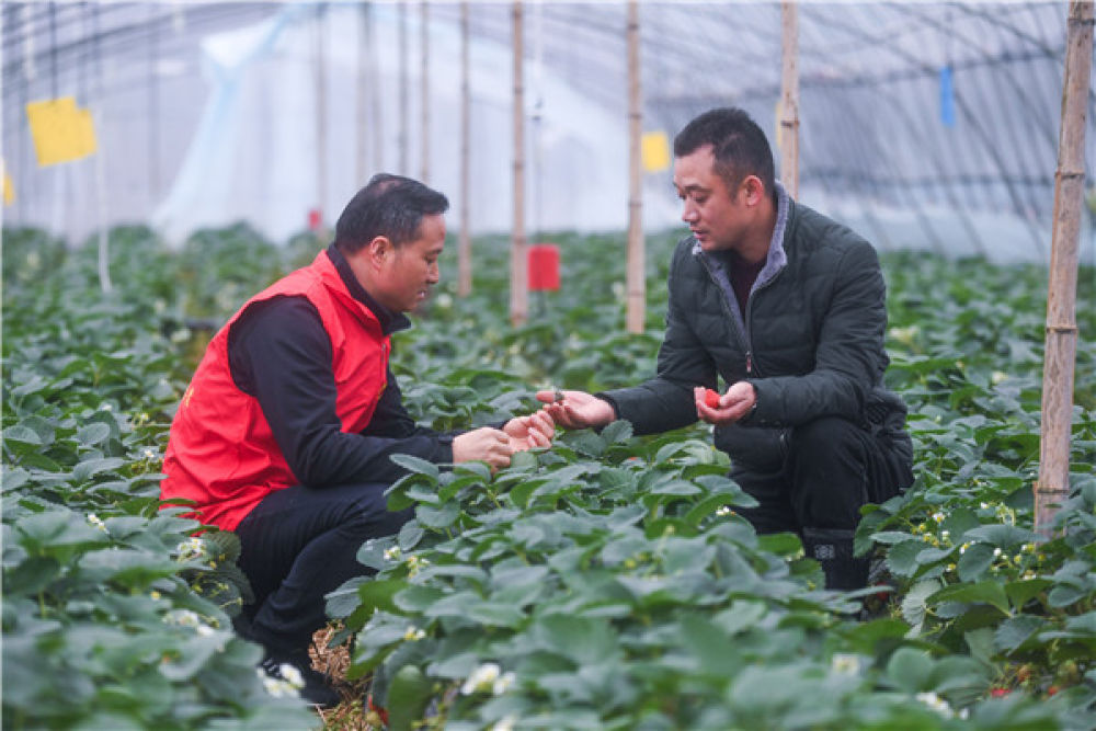 農(nóng)技人員(左)在對種植戶進(jìn)行技術(shù)指導(dǎo) 徐昱 攝