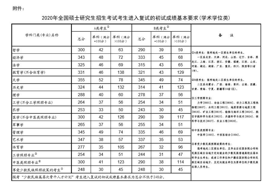 附件:2020年全國碩士研究生招生考試考生進入復試的初試成績基本要求