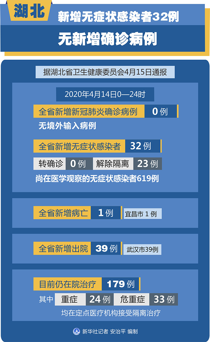 新華社武漢4月15日電(記者李偉、王作葵)據湖北省衛生健康委員會15日通報,2020年4月14日0—24時,全省新增新冠肺炎確診病例0例,無境外輸入病例。全省新增無癥狀感染者32例,轉確診0例,解除隔離23例,尚在醫學觀察的無癥狀感染者619例。