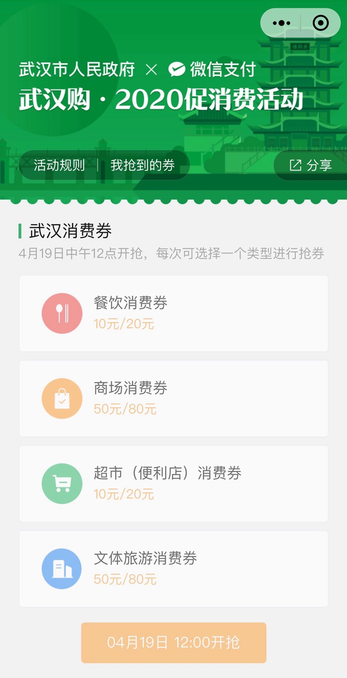 根據(jù)安排,“武漢消費(fèi)券”將在阿里巴巴、美團(tuán)點(diǎn)評、騰訊等3家企業(yè)自有線上平臺上按周投放,總體投放分兩期執(zhí)行。其中,第一期為4月19日至5月31日,首次投放活動將在4月19日中午12時進(jìn)行,在漢人員可登錄支付寶、美團(tuán)、大眾點(diǎn)評、微信等手機(jī)程序,搜索“武漢”“消費(fèi)券”等關(guān)鍵詞進(jìn)入活動頁面參與領(lǐng)券。第二期為6月1日至7月31日,具體投放時間另行公布。
