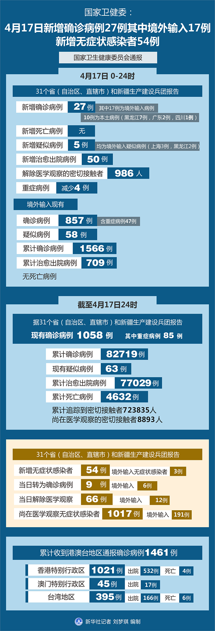 截至4月17日24時,據31個?。ㄗ灾螀^、直轄市)和新疆生產建設兵團報告,現有確診病例1058例(其中重癥病例85例),累計治愈出院病例77029例,累計死亡病例4632例,累計報告確診病例82719例,現有疑似病例63例。累計追蹤到密切接觸者723835人,尚在醫學觀察的密切接觸者8893人。
