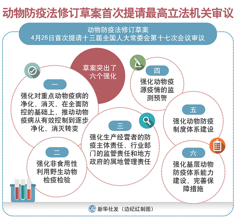 草案突出了六個強化:一是強化對重點動物疫病的凈化、消滅,在全面防控的基礎上,推動動物疫病從有效控制到逐步凈化、消滅轉變;二是強化非食用性利用野生動物檢疫檢驗;三是強化生產經營者的防疫主體責任、行業(yè)部門的監(jiān)管責任和地方政府的屬地管理責任;四是強化動物疫源疫情的監(jiān)測預警;五是強化動物防疫制度體系建設;六是強化基層動物防疫體系能力建設,完善保障措施。