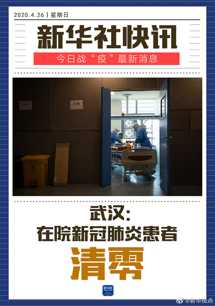 當(dāng)日下午在北京舉行的國務(wù)院聯(lián)防聯(lián)控機(jī)制新聞發(fā)布會上,國家衛(wèi)生健康委新聞發(fā)言人米鋒也介紹說,經(jīng)過武漢和全國援鄂醫(yī)務(wù)人員的共同努力,至26日,武漢在院新冠肺炎患者清零。