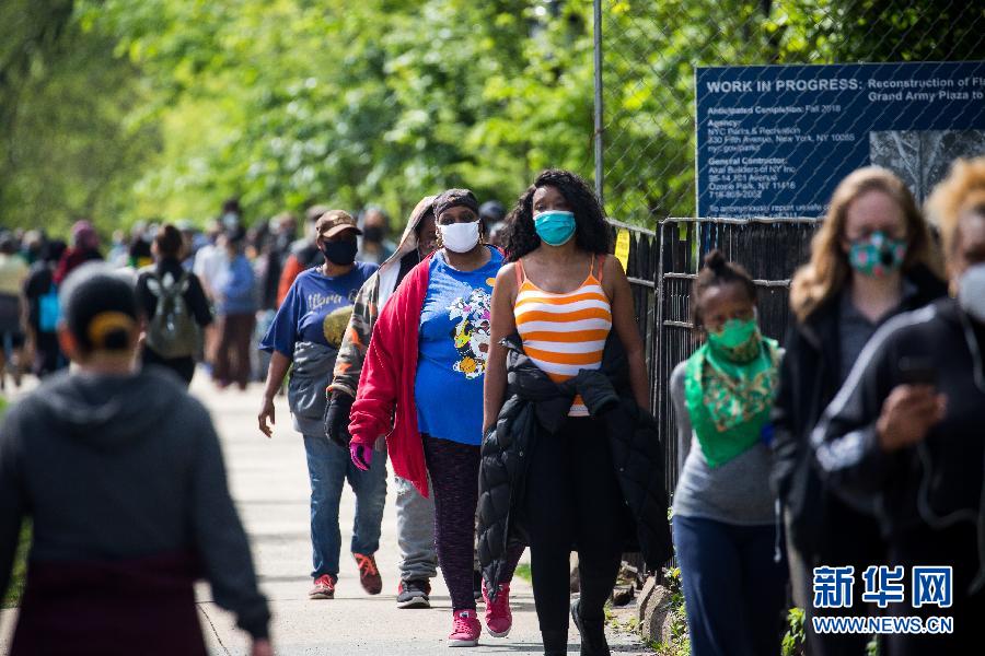 5月3日,在美國紐約,人們在一個發放點排隊領取口罩。 新華社發(郭克攝)