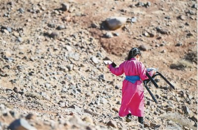 內蒙古自治區阿拉善左旗蒙古族學校四年級學生策耿拿著板凳尋找避風處上網課。新華社記者 連 振攝