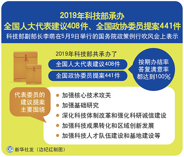 新華社北京5月9日電(記者張泉、董瑞豐)科技部副部長李萌在9日舉行的國務院政策例行吹風會上表示,去年科技部共承辦了全國人大代表建議408件、全國政協委員提案441件,按期辦結率和答復滿意率都達到100%。