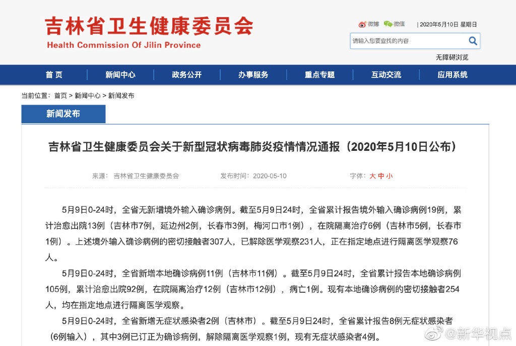 5月9日0-24時,全省新增本地確診病例11例(吉林市11例)。截至5月9日24時,全省累計報告本地確診病例105例,累計治愈出院92例,在院隔離治療12例(吉林市12例),病亡1例。現(xiàn)有本地確診病例的密切接觸者254人,均在指定地點進行隔離醫(yī)學(xué)觀察。
