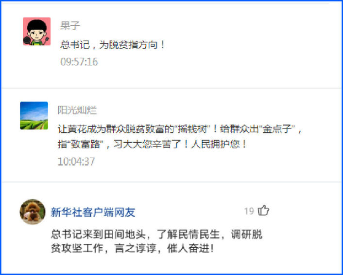 消息播發(fā)后,引起網(wǎng)民熱烈反響。大家紛紛為總書記關心脫貧攻堅、親自指導產業(yè)扶貧叫好,為總書記心系群眾、深入一線點贊。