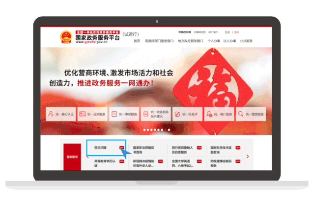 你可以通過電腦使用網(wǎng)頁搜索找到“國家政務(wù)服務(wù)平臺”后,首頁點擊“百日招聘”進(jìn)入訪問,也可以點擊下方圖片直達(dá)“百日招聘”專題。