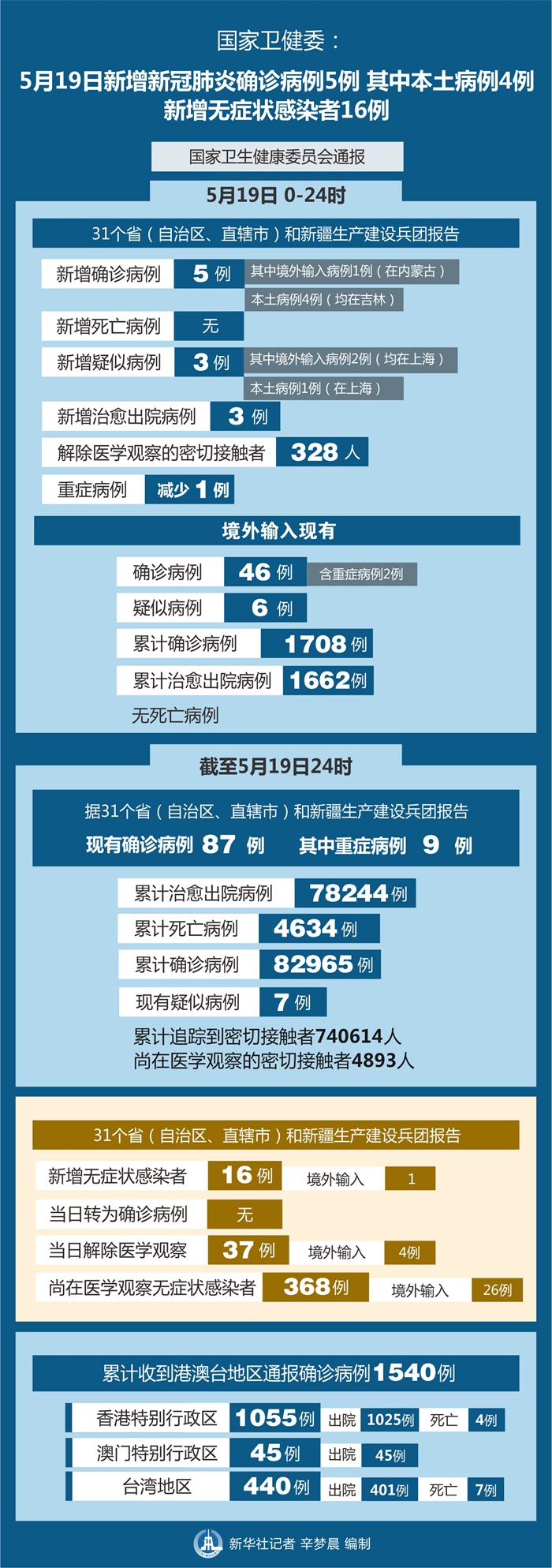 新華社北京5月20日電(記者王秉陽、王希)國家衛健委20日通報,5月19日0—24時,31個省(自治區、直轄市)和新疆生產建設兵團報告新增確診病例5例,其中境外輸入病例1例(在內蒙古),本土病例4例(均在吉林);無新增死亡病例;新增疑似病例3例,其中境外輸入病例2例(均在上海),本土病例1例(在上海)。