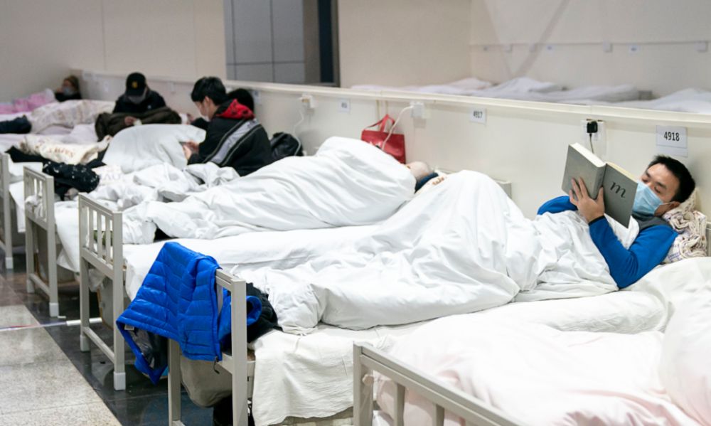 2月5日晚,一名患者在武漢“江漢方艙醫院”內看書。新華社記者熊琦攝