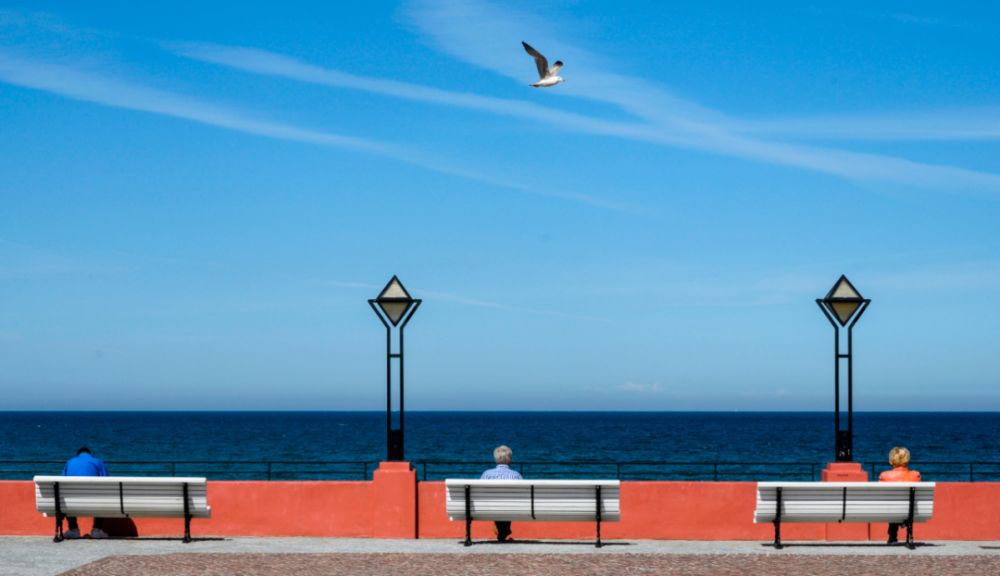 5月21日,在德國賓茨,人們坐在海邊的長椅上。歐洲地區新冠疫情持續緩解,多國已重新開放或計劃開放邊界,為即將到來的夏季旅游旺季創造條件。新華社/法新