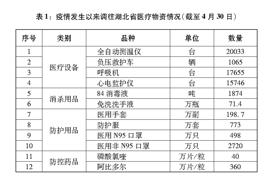 開展新中國成立以來規(guī)模最大的醫(yī)療支援行動(dòng)。調(diào)動(dòng)全國醫(yī)療資源和力量,全力支持湖北省和武漢市醫(yī)療救治。自1月24日除夕至3月8日,全國共調(diào)集346支國家醫(yī)療隊(duì)、4.26萬名醫(yī)務(wù)人員、900多名公共衛(wèi)生人員馳援湖北。19個(gè)省份以對口支援、以省包市的方式支援湖北省除武漢市以外16個(gè)地市,各省在發(fā)生疫情、防控救治任務(wù)十分繁重的情況下,集中優(yōu)質(zhì)醫(yī)療資源支援湖北省和武漢市。人民解放軍派出4000多名醫(yī)務(wù)人員支援湖北,承擔(dān)火神山醫(yī)院等3家醫(yī)療機(jī)構(gòu)的醫(yī)療救治任務(wù),空軍出動(dòng)運(yùn)輸機(jī)緊急運(yùn)送醫(yī)療物資。各醫(yī)療隊(duì)從接受指令到組建2小時(shí)內(nèi)完成,24小時(shí)內(nèi)抵達(dá),并自帶7天防護(hù)物資,抵達(dá)后迅速開展救治。在全國緊急調(diào)配全自動(dòng)測溫儀、負(fù)壓救護(hù)車、呼吸機(jī)、心電監(jiān)護(hù)儀等重點(diǎn)醫(yī)療物資支援湖北省和武漢市(表1)。從全國調(diào)集4萬名建設(shè)者和幾千臺(tái)機(jī)械設(shè)備,僅用10天建成有1000張病床的火神山醫(yī)院,僅用12天建成有1600張病床的雷神山醫(yī)院。短短10多天建成16座方艙醫(yī)院,共有1.4萬余張床位。加強(qiáng)臨床血液供應(yīng),10個(gè)省份無償支援湖北省紅細(xì)胞4.5萬單位,血小板1762個(gè)治療量,新鮮冰凍血漿137萬毫升(不含恢復(fù)期血漿)。大規(guī)模、強(qiáng)有力的醫(yī)療支援行動(dòng),有力保障了湖北省和武漢市救治,極大緩解了重災(zāi)區(qū)醫(yī)療資源嚴(yán)重不足的壓力。