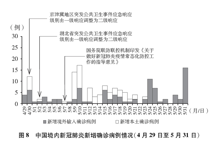 境內(nèi)疫情總體呈零星散發(fā)狀態(tài),局部地區(qū)出現(xiàn)散發(fā)病例引起的聚集性疫情,境外輸入病例基本得到控制,疫情積極向好態(tài)勢持續(xù)鞏固,全國疫情防控進(jìn)入常態(tài)化。加大力度推進(jìn)復(fù)工復(fù)產(chǎn)復(fù)學(xué),常態(tài)化防控措施經(jīng)受“五一”假期考驗(yàn)。經(jīng)中共中央批準(zhǔn),國務(wù)院聯(lián)防聯(lián)控機(jī)制派出聯(lián)絡(luò)組,繼續(xù)加強(qiáng)湖北省疫情防控。(圖8)