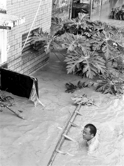 廣西田林暴雨引發泥石流,6月6日,利周瑤族鄉鄉長陸富雙涉水前往敬老院營救被困老人供圖/新華社