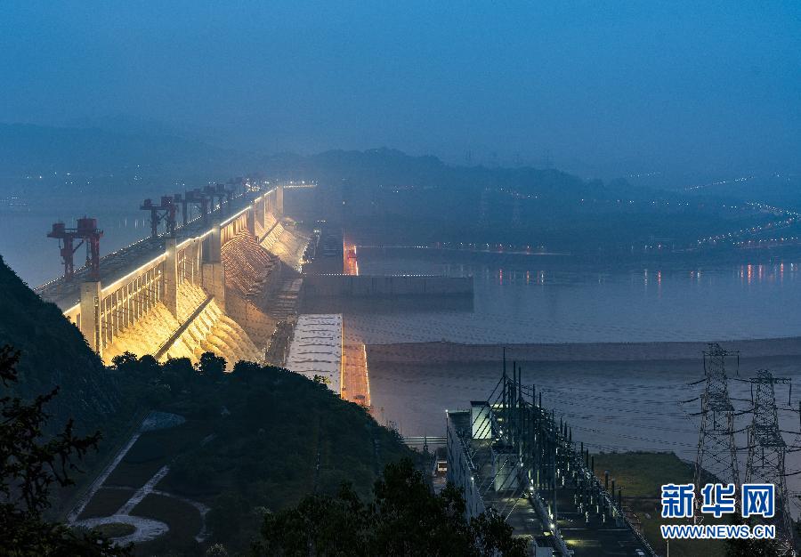 6月8日拍攝的三峽大壩泄洪閘夜景。 6月8日17時,三峽水庫水位消落至144.99米,提前兩天完成消落任務。據長江水利委員會介紹,三峽水庫本輪消落自2019年12月開始,水位自正常蓄水位175米左右消落至汛限水位145米,共消落水位約30米,騰出防洪庫容221.5億立方米,為迎戰長江流域可能發生的洪水提供安全保障。 新華社發(向紅梅 攝)