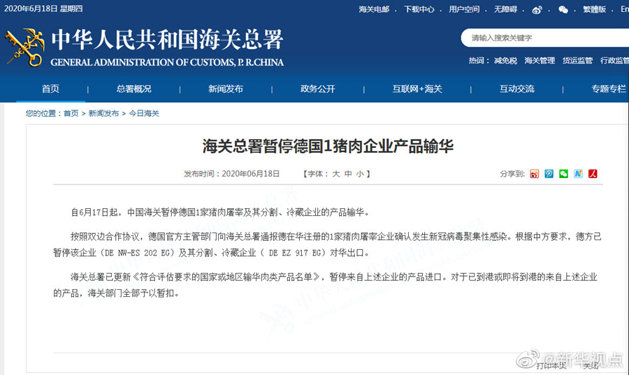 海關總署18日發布公告,自6月17日起,中國海關暫停德國一家豬肉屠宰及其分割、冷藏企業的產品輸華。按照雙邊合作協議,德國官方主管部門向海關總署通報德在華注冊的一家豬肉屠宰企業確認發生新冠病毒聚集性感染。根據中方要求,德方已暫停該企業及其分割、冷藏企業對華出口。海關總署已更新《符合評估要求的國家或地區輸華肉類產品名單》,暫停來自上述企業的產品進口。對于已到港或即將到港的來自上述企業的產品,海關部門全部予以暫扣。(記者劉紅霞)