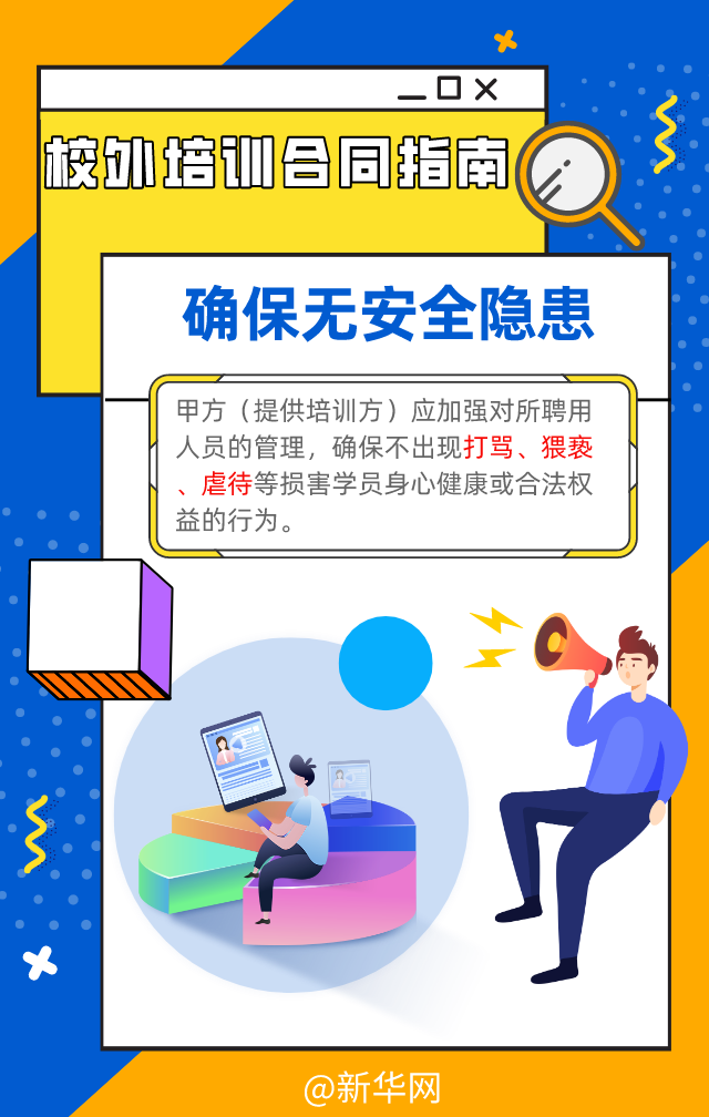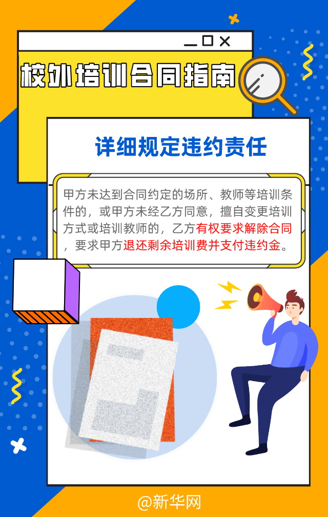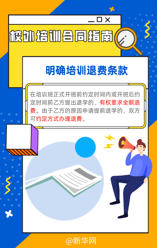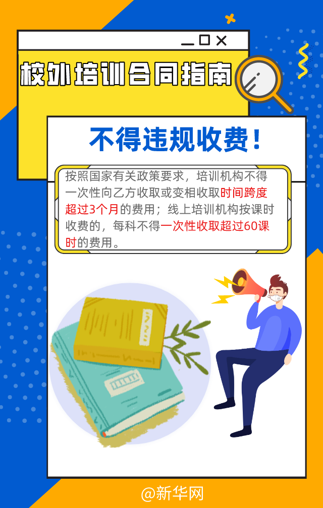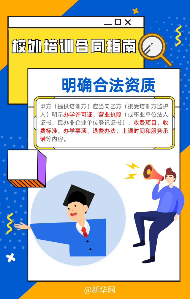 編輯: 盧俊宇 設計: 盧俊宇 2020年06月19日 10:54:51 來源: 新華網長期以來,校外培訓機構的資質問題,以及部分培訓機構存在違規收費、退費難、卷款“跑路”現象,這些令學生和家長發愁。教育部、市場監管總局近日發布《中小學生校外培訓服務合同(示范文本)》,供培訓者(學員)監護人與開展中小學生校外培訓的培訓機構簽訂培訓合同時參照使用,為規范校外培訓做出新的探索。一起來看看,這份“國家版”標準合同有哪些亮點?