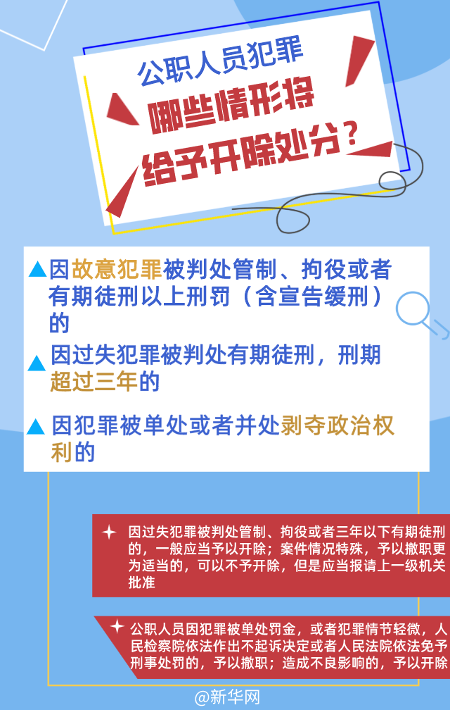 編輯: 張慶水 設(shè)計(jì): 2020年06月22日 11:16:34 來源: 新華網(wǎng)6月20日,十三屆全國人大常委會(huì)第十九次會(huì)議表決通過公職人員政務(wù)處分法。政務(wù)處分法強(qiáng)化對(duì)公職人員的管理監(jiān)督,使政務(wù)處分匹配黨紀(jì)處分、銜接刑事處罰,構(gòu)筑起懲戒公職人員違法行為的嚴(yán)密法網(wǎng)。幾組海報(bào)帶你一起來了解。