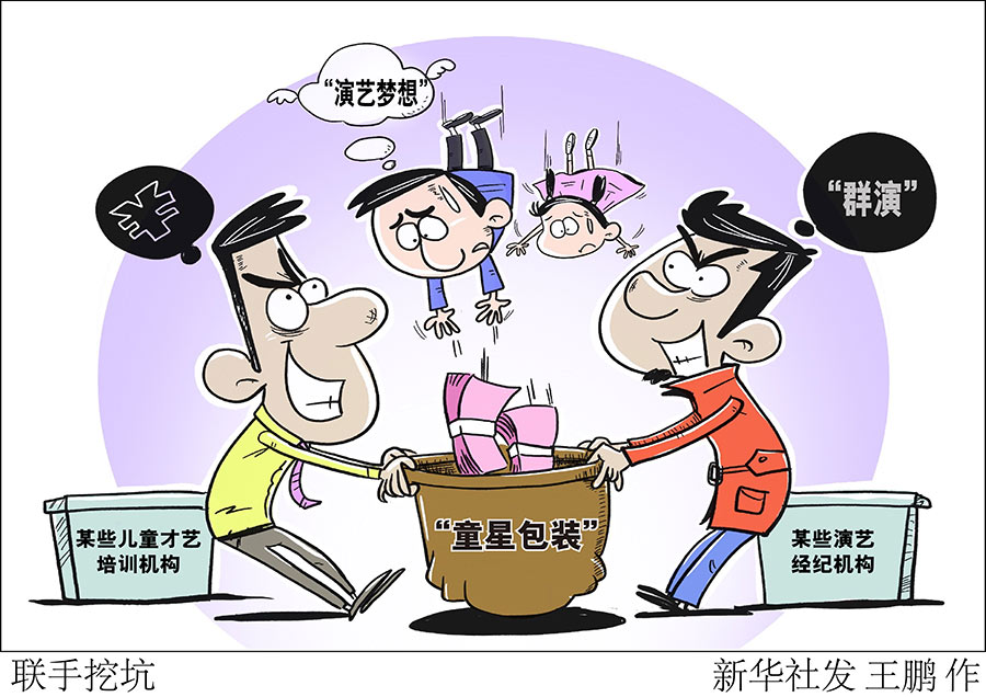 在兒童才藝培訓市場缺乏有效監管的現狀下,一些培訓機構、演藝經紀公司以才藝培訓作幌子,動輒向家長收取上萬元培訓費用,其實是兜售表演機會;而演藝經紀機構一旦高價“招募”到一名兒童演員,就會給培訓機構分成,培訓機構借此也能顯示與電視臺、節目制作方有合作,對招生構成“金字招牌”,容易吸引家長報班,二者合作心照不宣。