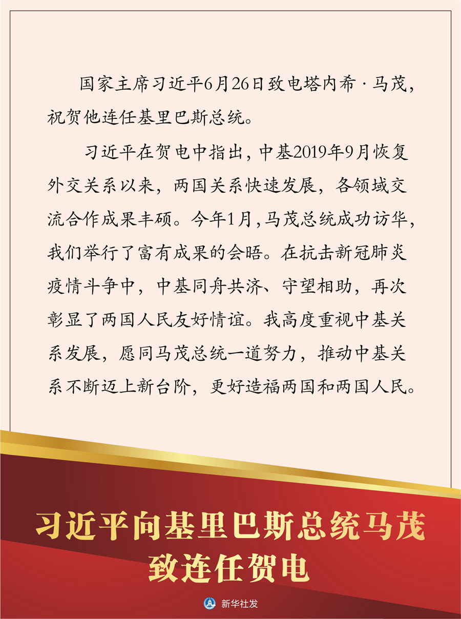 習近平在賀電中指出,中基2019年9月恢復外交關系以來,兩國關系快速發展,各領域交流合作成果豐碩。今年1月,馬茂總統成功訪華,我們舉行了富有成果的會晤。在抗擊新冠肺炎疫情斗爭中,中基同舟共濟、守望相助,再次彰顯了兩國人民友好情誼。我高度重視中基關系發展,愿同馬茂總統一道努力,推動中基關系不斷邁上新臺階,更好造福兩國和兩國人民。