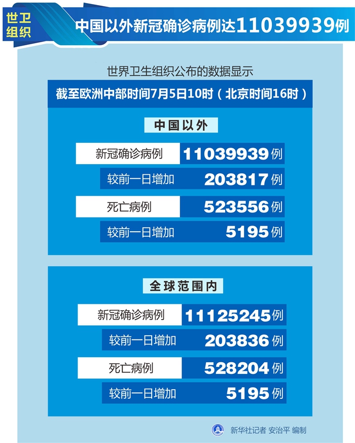 新華社日內瓦7月5日電(記者劉曲)世界衛生組織5日公布的最新數據顯示,中國以外新冠確診病例達到11039939例。