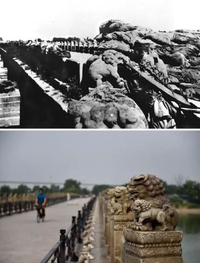 上圖為守衛盧溝橋的29軍士兵抵抗日本侵略軍入侵(資料照片);下圖為2017年7月3日拍攝的盧溝橋(新華社記者 張晨霖 攝)。