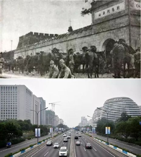 上圖為1937年8月8日,日本騎兵在朝陽門車站集結(資料照片);下圖為2017年7月3日拍攝的朝陽門地區(新華社記者 張晨霖 攝)。