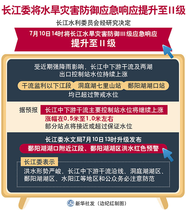 新華社武漢7月10日電(記者李思遠、樂文婉)鑒于當前長江流域洪水防御的嚴峻形勢,長江水利委員會經研究決定,10日14時將長江水旱災害防御Ⅲ級應急響應提升至Ⅱ級。