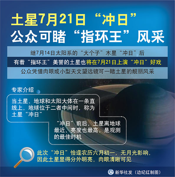 新華社天津7月19日電(記者周潤健)繼7月14日太陽系的“大個子”木星“沖日”后,有著“指環(huán)王”美譽的土星也將在7月21日上演“沖日”好戲,公眾憑借肉眼或小型天文望遠鏡可一睹土星的靚麗風(fēng)采。