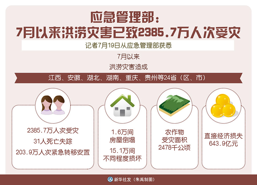 新華社北京7月19日電(記者魏玉坤)記者19日從應急管理部獲悉,7月以來,洪澇災害造成江西、安徽、湖北、湖南、重慶、貴州等24省(區、市)2385.7萬人次受災,31人死亡失蹤,203.9萬人次緊急轉移安置。