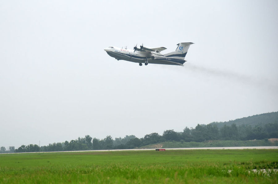 7月26日,水陸兩棲飛機AG600在日照山字河機場起飛。新華社記者 王凱 攝
