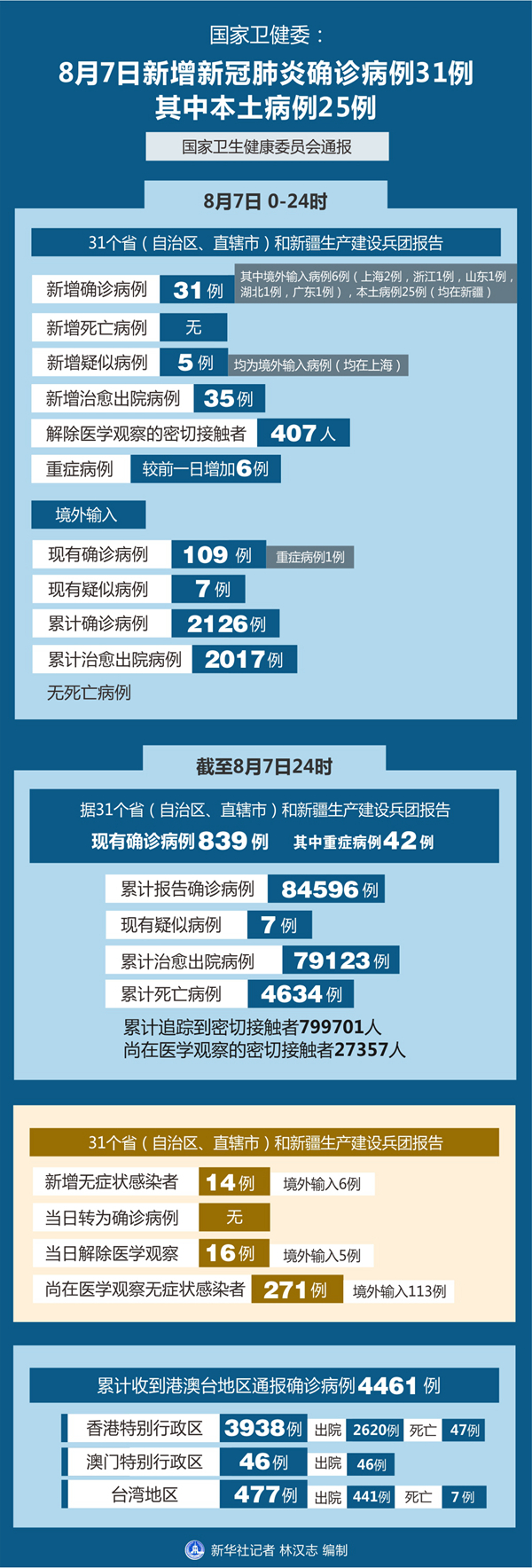 截至8月7日24時,據31個省(自治區、直轄市)和新疆生產建設兵團報告,現有確診病例839例(其中重癥病例42例),累計治愈出院病例79123例,累計死亡病例4634例,累計報告確診病例84596例,現有疑似病例7例。累計追蹤到密切接觸者799701人,尚在醫學觀察的密切接觸者27357人。