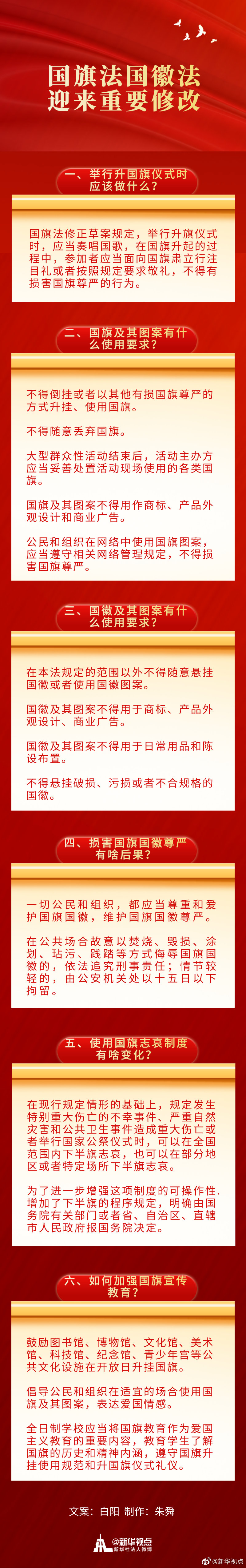 升國旗儀式上應該做什么?參加大型群眾活動過后的國旗要怎么處理?損害國旗國徽尊嚴的行為有什么后果?8日,國旗法修正草案和國徽法修正草案提請全國人大常委會會議審議。戳大圖,了解兩法修正草案的重點↓↓ ????