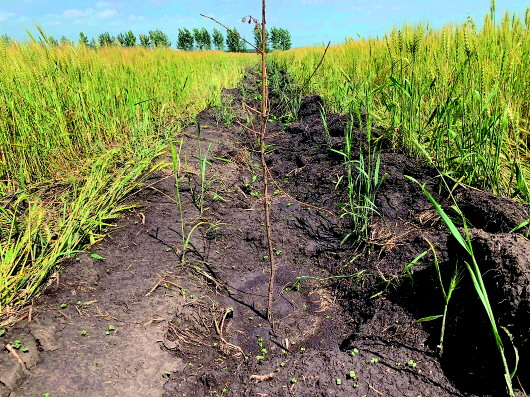 上圖:8月2日,陳巴爾虎旗特尼河林場大片麥田、油菜田,被鏟出一道道黑綠相間的“斑馬線”。中圖:8月2日,陳巴爾虎旗特尼河林場一處被毀的麥田。下圖:8月2日,陳巴爾虎旗特尼河林場一處被毀的麥田里,一些突擊種上的樹苗已經枯萎?!”緢笥浾咄蹙笖z