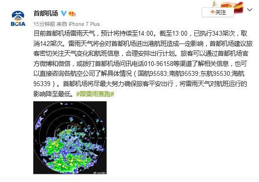 旅客可以通過首都機場官方微博和微信,或撥打首都機場問訊電話010-96158等渠道了解相關信息,也可以直接咨詢各航空公司了解具體情況(國航95583;南航95539;東航95530;海航95339)。首都機場將盡最大努力確保旅客平安出行,將雷雨天氣對航班運行的影響降至最低。