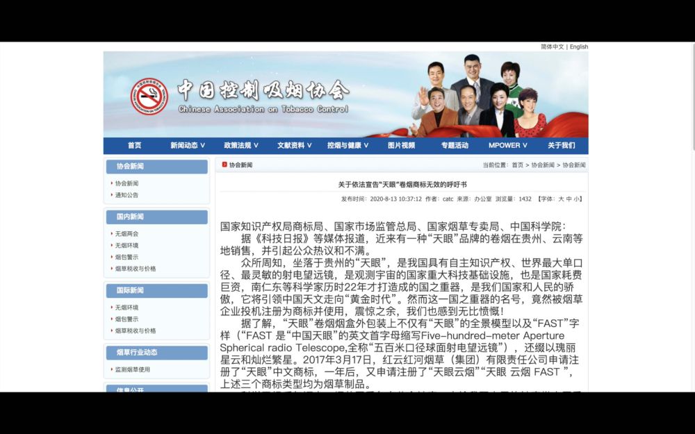 針對(duì)“天眼”被煙草企業(yè)注冊(cè)商標(biāo)并使用一事,中國(guó)控制吸煙協(xié)會(huì)8月13日在其官網(wǎng)發(fā)布聲明,希望國(guó)家知識(shí)產(chǎn)權(quán)局商標(biāo)局等部門對(duì)此事予以關(guān)注。