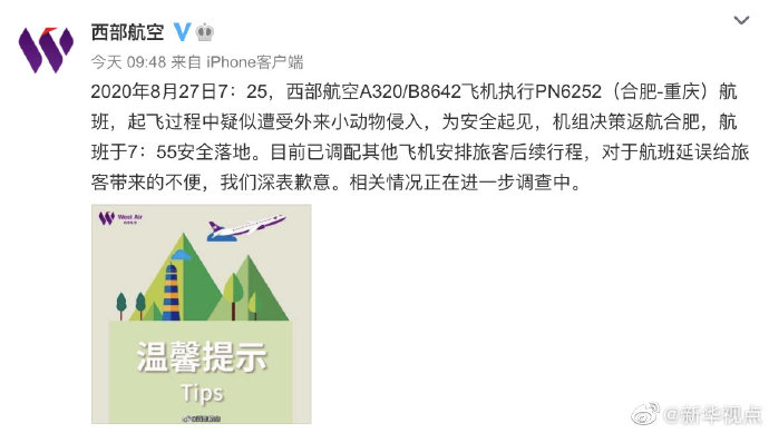 8月27日,西部航空官方微博通報稱,7時25分,合肥飛往重慶的PN6252航班在起飛途中疑似遭受外來小動物侵入,為安全起見,機組決定返航,航班于7時55分安全降落。記者從西部航空獲悉,隨后,航空公司安排另一架客機于10時01分運送該航班乘客,并于11時50分安全落地重慶。西部航空稱,除原航班延誤外,返航事件未對乘客、航司及合肥新橋國際機場造成其他影響。導致客機返航的具體原因仍在調查中。(記者林翔、汪奧娜)