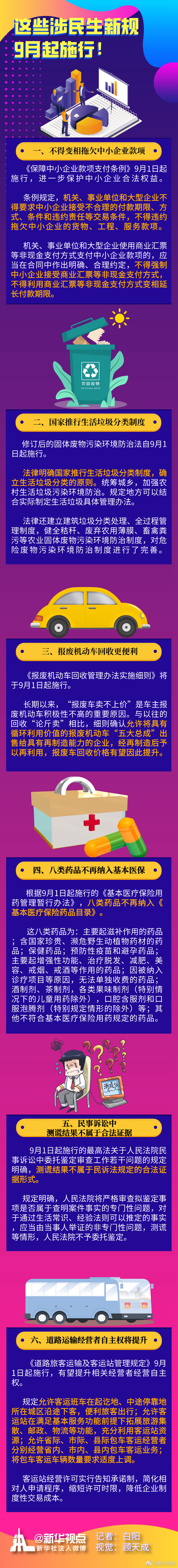 不得變相拖欠中小企業款項、國家推行生活垃圾分類制度、報廢機動車回收更加便利……即將到來的9月,又一批民生新規開始施行,給你我帶來實惠。